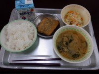 今日の給食です。 カレーうどん、和風サラダ、ごまドレッシング、ごはん、牛乳です...