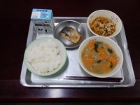 今日の給食です。 いわしフライ、野菜いため、みそ汁、ごはん、牛乳です。いわしフ...