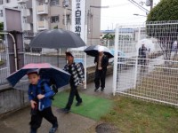 下校の様子です。 本降りの雨の中、児童たちが下校していきます。時おり服やや強い...