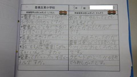 デジタルが進む中、こうしてお礼の気持を質問や感想とともに伝えるのは、とても温かな気持ちになります。出前授業では、新入社員研修もかねて行われました。参加した子どもたちの中に、どうしてこの仕事を選んだのかと尋ねる子どもがいました。「人を幸せにできるしごとだから」と答えたと聞きました。心ほっこりしました。手紙を綴じる時には、南海電車のカラーも考えて色をチョイスしたとのこと!どうかお礼の気持ちが伝わりますように~。