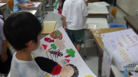 虫さんとたのしく遊ぶ絵を描いています。この後,絵の具にチャレンジするのだそう。