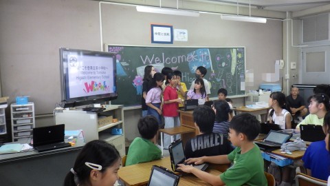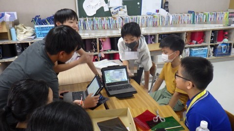 6年生は「ステンドグラスづくり」。さすがです。英語の準備もすばらしく,アレンジして手ぶり身振りも入れて説明していました。ここで役に立つのがタブレット。うまく使いこなしていました。