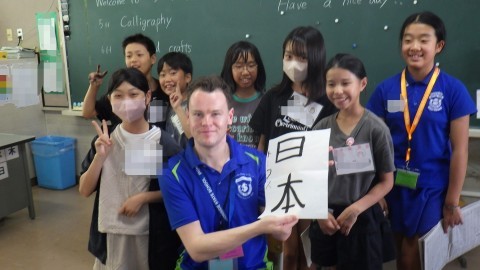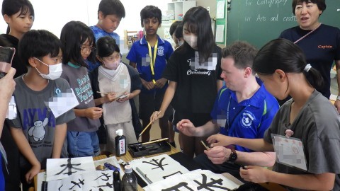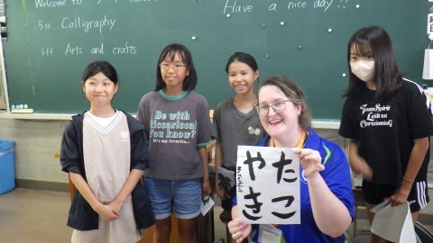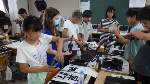 5年生は習字と折り紙をやってくれました。いろいろなお手本から,自分の好きな言葉をチョイスします。おすしや,たこやき,日本,などなど,いろいろな言葉がお手本として書かれていました。