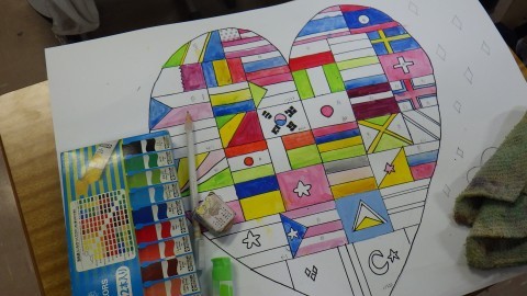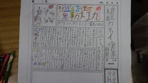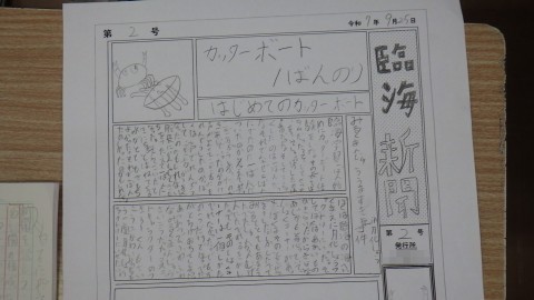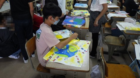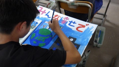 平和を願うポスターをかいています。臨海学習のことを新聞にまとめています。それぞれの課題にそれぞれ静かに取り組んでいました。