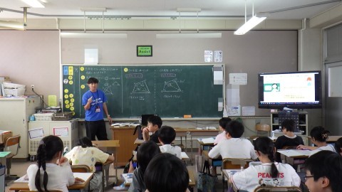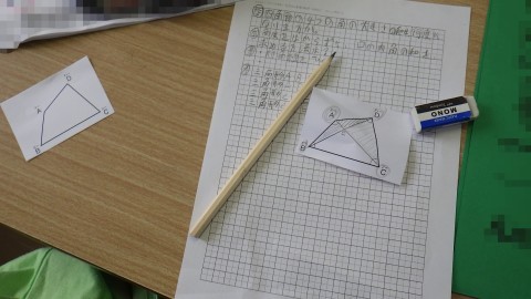 5年生でも図形の学習をしています。四角形の内角の和は何度かを考えています。対角線を引いて考えると,交わったところの余分な角をたし算してしまいます。どうして720度―360度でひき算がでてくるかを考えていました。角度は目に見えないので,なかなか量としてみることが難しい勉強です。小さいころにタングラムなどで遊ぶなど図形に親しんで大きくなっていけるといいなと思います。