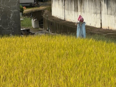 5年生が春に田植えをして地域の方にお世話になっているモチミノリの様子です。かかしもいます。そろそろ稲刈りです。