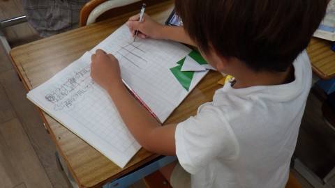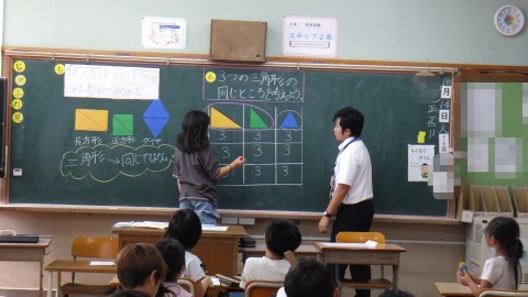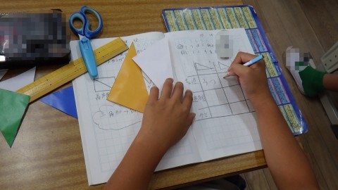 3つとも表に書いてまとめると一緒になりました。「あれ…一緒?」と尋ねると,仲間分けができるという話に展開。直角があるものとないものとに分けられるものが分かりました。
