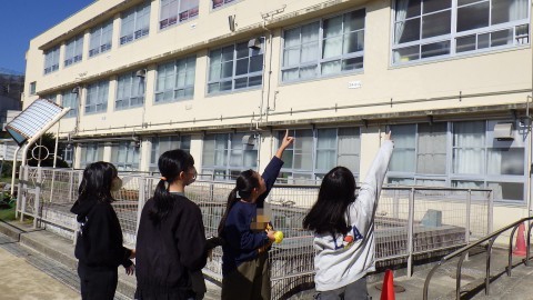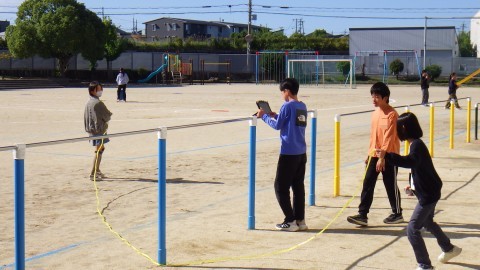 実際に校舎の高さが測れるか縮尺を使って考えています。
