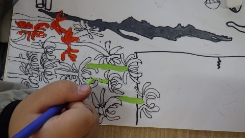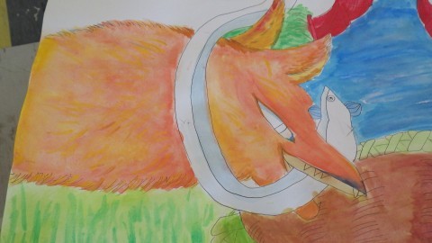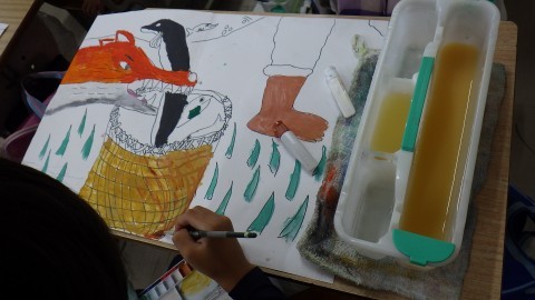 水彩画を描いています。自分の表現したいことを色で描くのは難しいっといっている子がいました。でも,細かいところまでひとつひとつ丁寧に取り組んでいました。