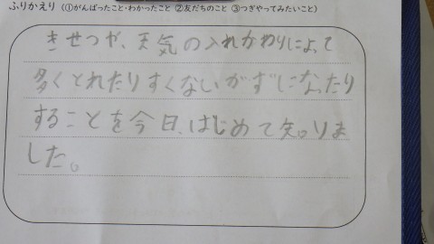 野菜のそれぞれでとれた大きさに違いがありました。また6月と7月を比べた中で,きゅうりだけが6月が多かったという結果がありました。普通なら暑くなる7月が取れるのかと思いましたが,教員も調べてみると,きゅうりは暑さに弱いということで,実際のデータから学びもありました。子どもたちの中には,暑さや雨の影響があることを考える子もいました。たくさんのデータを本当にここまでよく分析できたなと感心しました。