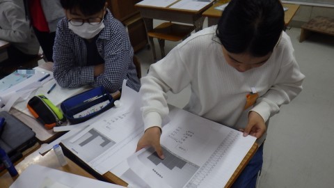 野菜の価格設定をしています。平均値,最大値,最小値,最頻値,中央値,ヒストグラムなど,必要に応じて,保護者アンケートと市場調査のそれらの値をみながら,グループで最適な値段を考えています。