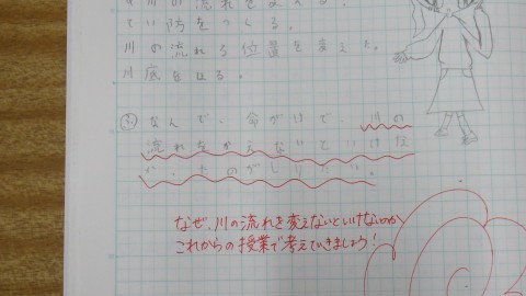 ノートには,前の時間に「なぜ大和川はつけかえられたのだろう」という問いが書かれていました。今日は,初任者研修がありましたので,この続きを考えました。子どもたちは資料を元に,洪水の様子,その土地の様子をイメージし,自分の考えを思い思いに発想し,考えていました。他の先生たちも見て,お互いに学び合う機会にしています。