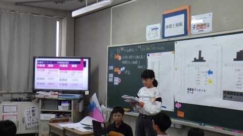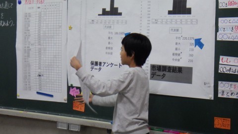 大根の適正価格はいくらか?保護者アンケートと市場調査の比較で考えました。代表値と散らばりを関係づけながら,根拠をもって語っていました。