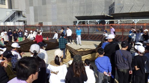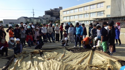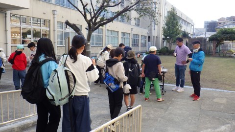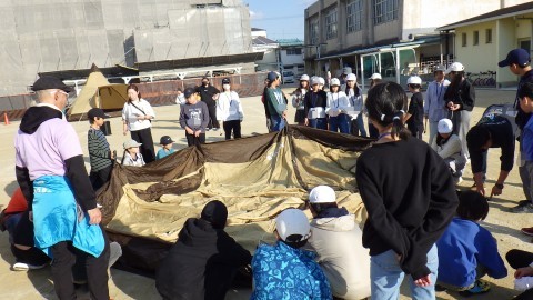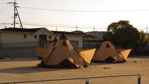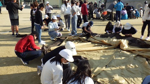 地域のワイワイキャンプがおこなわれました。昨年令和6年度は,150周年記念式典があり,キャンプがおこなわれなかったので,1年ぶりの開催となりました。はじめの挨拶が終わり,早速テントの立て方を学びました。自分たちでテントを立てる経験をしました。もしものためにと地域で買っているテントは,年に1回こうして練習のために使われています。