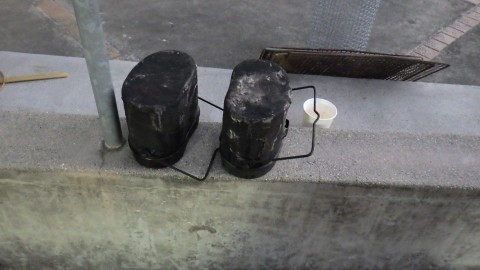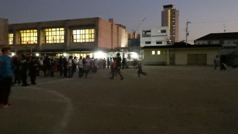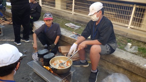 煮えるまで,火のそばで混ぜるのも胴にいったもの!ご飯は炊けた後さかさまに。一方でレクリエーションも楽しみました。この日は日の入りが4時55分。つるべおとしのようにあっという間に日が落ちて…。