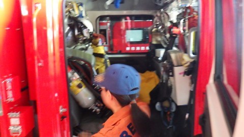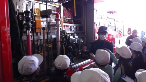 消防車の工夫も見せてもらいました。防火服は約20キロ。1分で出動。その後,消防車にのってから呼吸マスクもつけて…。などなど,いろいろな学びがありました。火事がなかったタイミングでしたので,みんなで迎えて下さり,貴重な体験をさせていただきました。青い服の救急隊,オレンジ服の救助隊,青い服の消防隊,消防士さんが救急や救助,消火など多岐にわたり力をあわせていることに驚かされました!