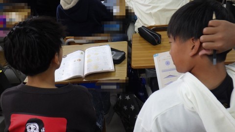 旅行の続き。6年生の教室で休み時間を迎えると,すぐに本を読んでいる子発見!友だちと勉強する子もいました。
