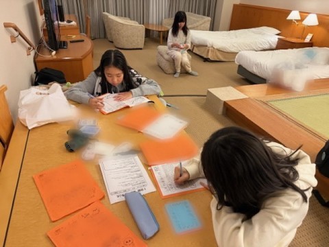 部屋でにぎやかにしているかな?と思いきや,お風呂に入っている子,振り返りを書いている子…。トランプで遊んでいる部屋ももちろんあります。かなりの盛り上がりで笑い転げている子どもたちもありました。でも,「先生,おれら,やってなさそうやろ?でももう全員振り返り書いてんねん!」と。ひとつひとつ考え精一杯頑張る姿があります。リーダー会議も急いで向かっていました。