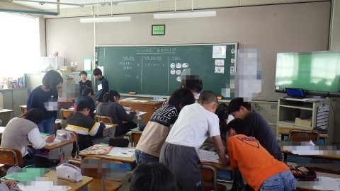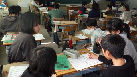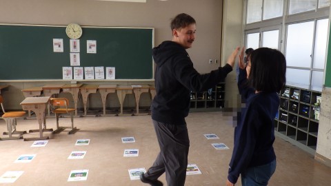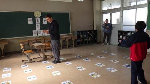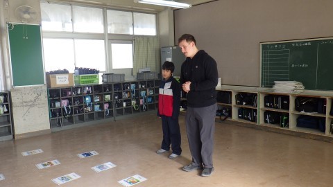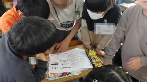 道案内のテストです。NSの先生に自分で場所を説明します。廊下ではどんなテストかと相談。どきどきが伝わってきます。うまく伝えられて,「well done」とハイタッチ。思いきり笑顔。見ている側もうれしくなります。教室ではみんなで英語の問題にチャレンジしていました。