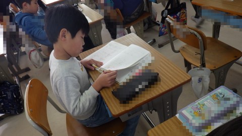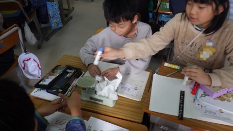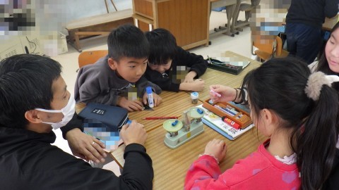 物には重さがある。当たり前のことのようですが,子どもたちはそこまで意識をして見えない重さを見ていません。今までは見える指標で物を比べていましたが,どうすると見えない「重さ」を見える化できるかを考えていきます。身の回りには重さの表示がありますが,体重も身体測定で測っていますが,感覚的な理解です。上皿天秤で2つのものの直接比較をしています。重さを比べてチャンピオンを決める冒頭の活動では先生も一緒に喜びながら進めています。子どもたちは「上皿天秤」を預かって,身の回りの物を比べます。「ティッシュ」をのせると,片方の皿が沈み,「重いんや…」とティッシュにも重さがあることを実感。重いものをのせないで…壊れませんように…と思う大人の思いもあり,ヒヤヒヤ。実体験はやはり貴重な経験となります。授業後の振り返りでは,前のページを見ながらどうかこうか考える子どももいました。今日の学びを改めて振り返ることを重ねていくことが大切です。今後は,「数値化」の発想がどのように生まれていくか楽しみです。教えるのではなく,発想をうみだすことできるかな・・・。