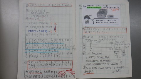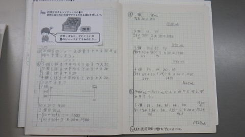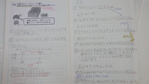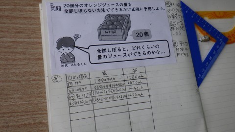 1つの時より,測定回数を増やすと,だんだんと予想が本当の値に近づく…?みんなも1~5個の場合を計算したのち,20個のジュース量を予想しました。本当はいくつなの?と子どもたち興味深々でした。ノートにも自分の考えがしっかりと書かれていました。
