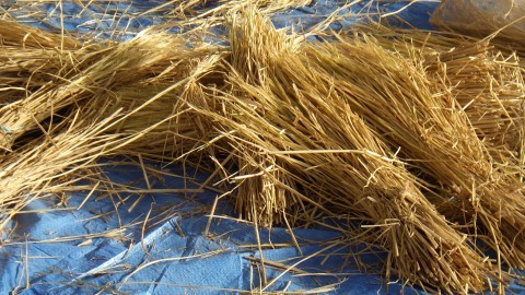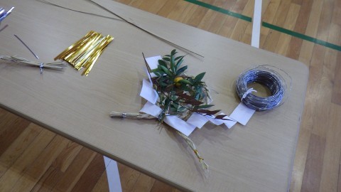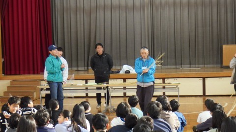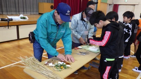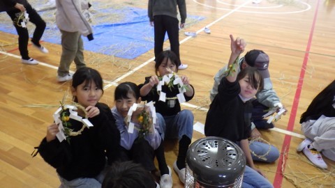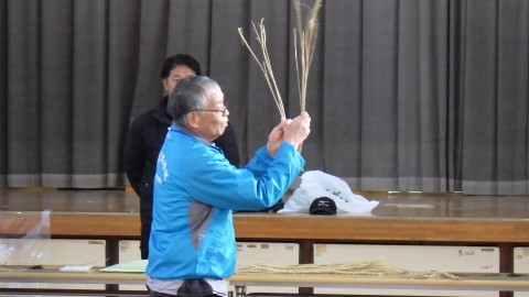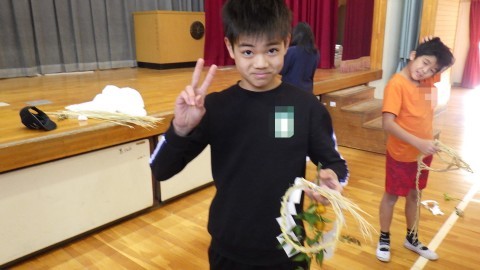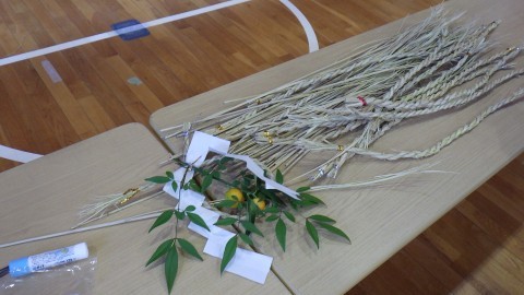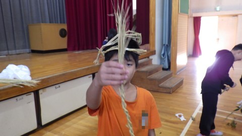 地域の福祉委員会の方が子どもたちにしめ縄のつくり方を教えに来てくださいました。子どもたちが育てた後のもち米の藁をなって作ります。藁をなうのは難しい難しい…。悪戦苦闘していました。ナンテンやキンカンの実も持ってきてくださり,きれいに飾り付もしました。