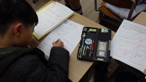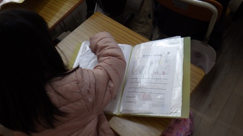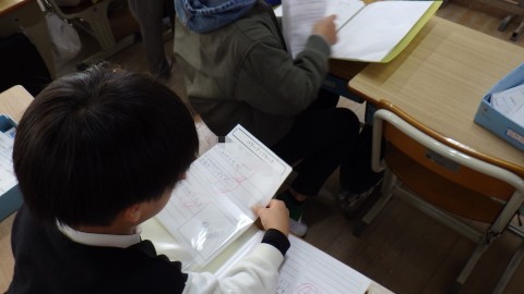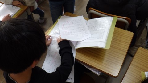 2学期に頑張ったことの振り返りをしています。できるようになったことがいっぱい見つかったかな。プリントの整理もしていました。