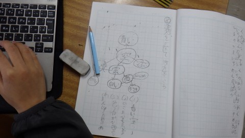 思考ツール(ウエブ図)を書いています。キーワードからたくさんの言葉を広げられるようになるといいですね。