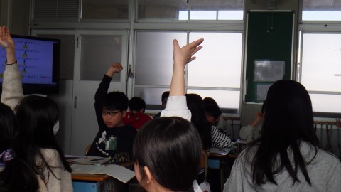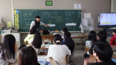 袋の中に30個ブロックが入っています。そのうち,10個引きます。当たりだった数を数えます。また戻します。それを何回かやって,袋の中のあたりの数を予想します。何回もすることによって,そのデータのばらつきがどうなるか調べています。測定回数を増やすと,正確な数に近づくはずでしたが,測定の仕方がそろわなかったためにうまくいきませんでした。うまくいかないことも学びであり,どんなことを考えたか交流しました。