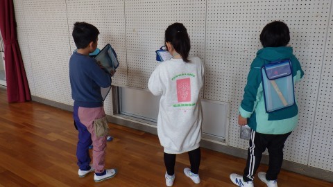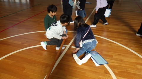 体育館で長い長さを測りました。1mのものさしが便利か,3mのものさしが便利か。いろんな道具で考えました。