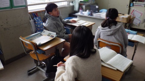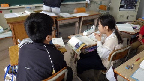物語の設定を考えています。みんなで考えを出し合うと,より深い味方になっていっていました。