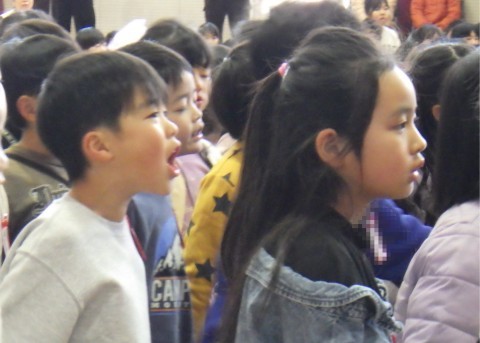 6年生の入場。4年生が新しく作ってくれた花のアーチをくぐります。進行は5年生。挨拶も自分の言葉で考えました。1年生はたくさんたくさんお世話になって…。お世話をした側の6年生の表情もほっこり。楽しい歌に,心躍ります。お辞儀もしっかりして終わりました。