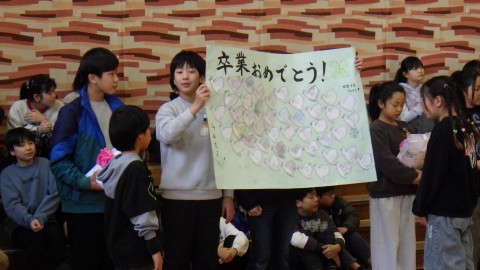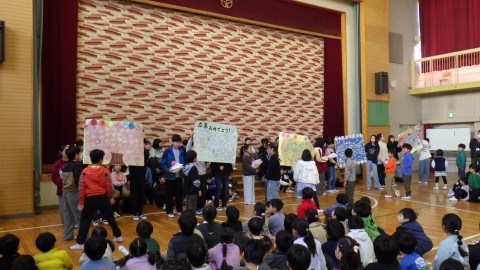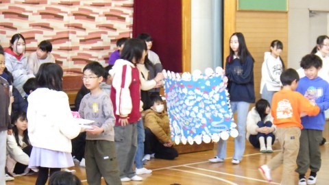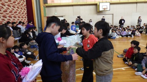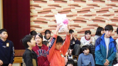 プレゼント交換もしました。在校生の皆さんからはメッセージのプレゼント。一人ひとり6年生と過ごした時間を思い出し書きました。6年生からは学校をピカピカにしてねと雑巾のプレゼントももらいました。