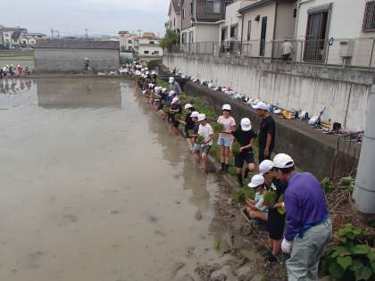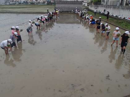 今日は学校で育てていた稲を田んぼに植えました。