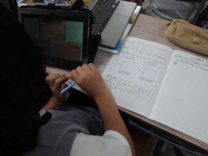 雨の多い梅雨の時期は、雨が降った時の地面の様子をじっくり見ることができます。でも、晴れてる日には見ることができませんので、この日はタブレットも活用しています。運動場に降ってたまっていたはずの水はどこにいってしまうのかな…と考えています。