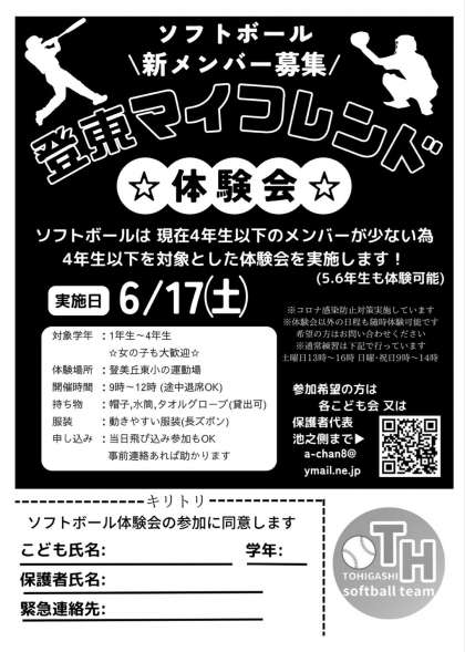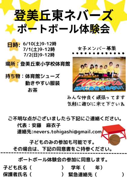 登美丘東こども会のポートボールとソフトボールの体験会があります。下記に案内のチラシを掲載していますので、ご覧ください。