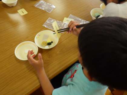 野田小学校の栄養教諭さんにきていただき、お箸の持ち方を学びました。小さな豆もとても上手につまんでいました。