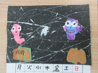 10月のカレンダーのテーマは「ハロウィン」です。絵の具がしみたスポンジを掌でおさ...