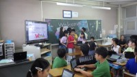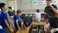 3年生の教室では,「サインをかいて!」と子どもたち。NSの先生に通訳をしてもらっ...