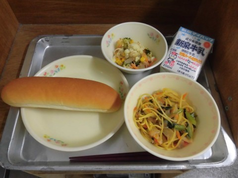ミニコッペパン じゃこと小松菜のスパゲティ 花野菜のマヨネーズ焼き 牛乳