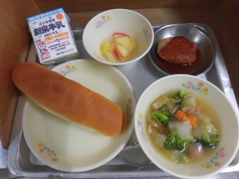 コッペパン ポトフ 鮭のマヨみそ焼き 牛乳