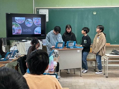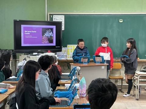 外国語は大阪にあるものやできることをグループでまとめて発表しました。それぞれのグループが自分たちで調べたことを英語で伝えています。