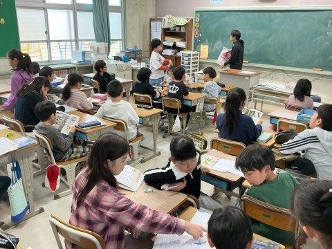 理科は季節の学習です。「春」ということで、鳥の鳴き声や植物などを観察して、春を探していました。