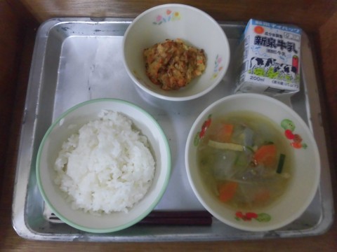 今日の給食は、ごはん、野菜スープ、オムレツ、セルフチキンライス、牛乳でした。