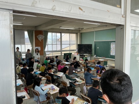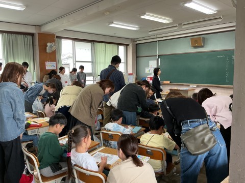 校長室前に置いてある,校長先生の畑でとれたとてもとても大きなキャベツを観察しにきてくれました。スーパーで買った一般的なキャベツと一緒に並べてあるので,「比べるとめっちゃ重い~」「どうしたら,これだけ大きくなるの?」「ほかの野菜もこんな風になるのかな?」など目をキラキラさせながら疑問がたくさん出てきていました。楽しく探究してほしいですね!