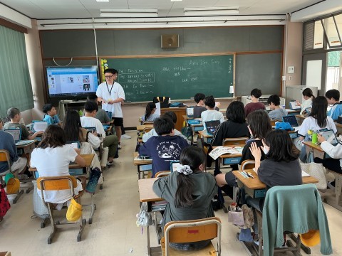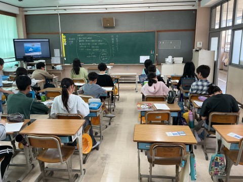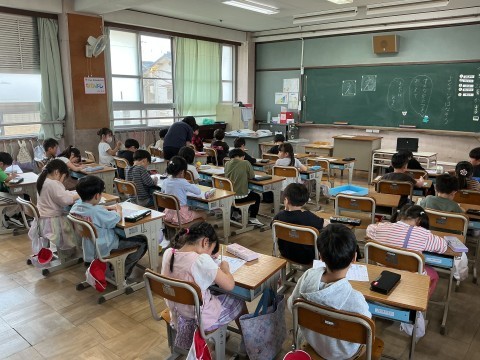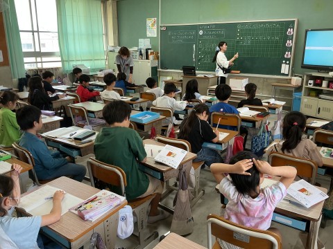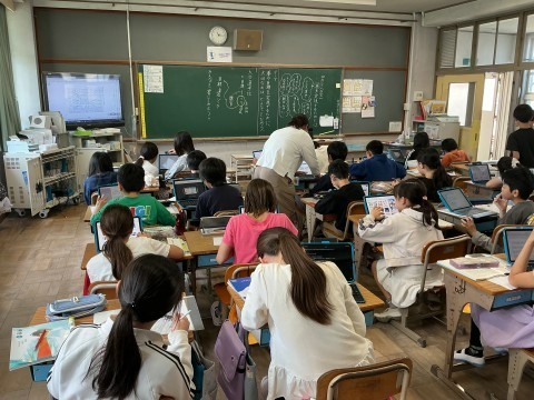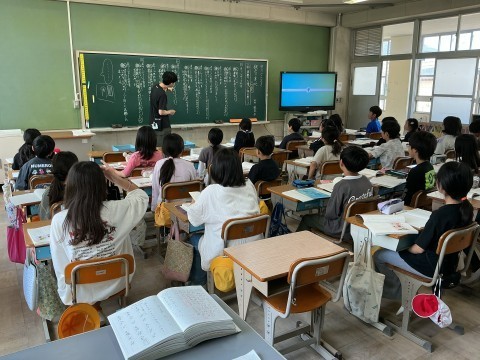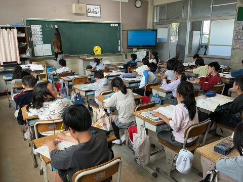 5年生の様子です。社会の授業では、地球儀を使って学習をしていました。具体物があると、とても分かりやすいですね。