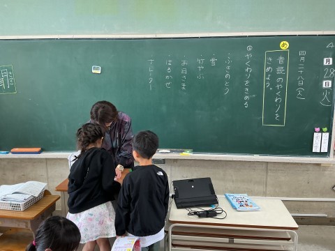 1年生の様子です。算数では「いくつといくつ」の学習で「1と5で6」「2と4で6」など6について学習していました。国語では,「え」の文字の学習です。気をつけるところをみんなで確認しながら学んでいました。