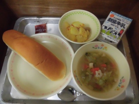 今日の給食は、ごはん、ポークカレーライス、豆とひじきのサラダ、和からしドレッシング、牛乳でした。