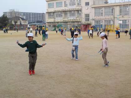 運動場でみんな元気に遊んでいます。縄跳びも上手に跳べるようになってきています。