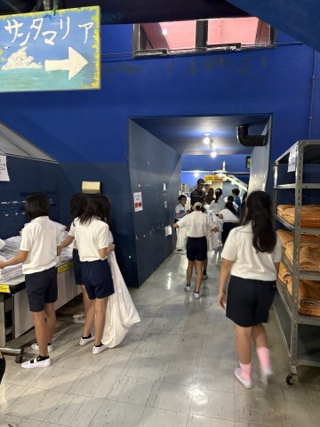 ベットのシーツをきれいにたたんで、係の人が返却します。